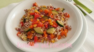 Reis nach Anweisung kochen. Währenddessen Zwiebel schälen und würfeln, Paprika waschen, säubern und in kleine Stücke (ca. 1cm groß) schneiden. Möhren schälen und würfeln. Zucchini waschen längst viertel und dann in Scheiben schneiden. Mais abtropfen lassen.