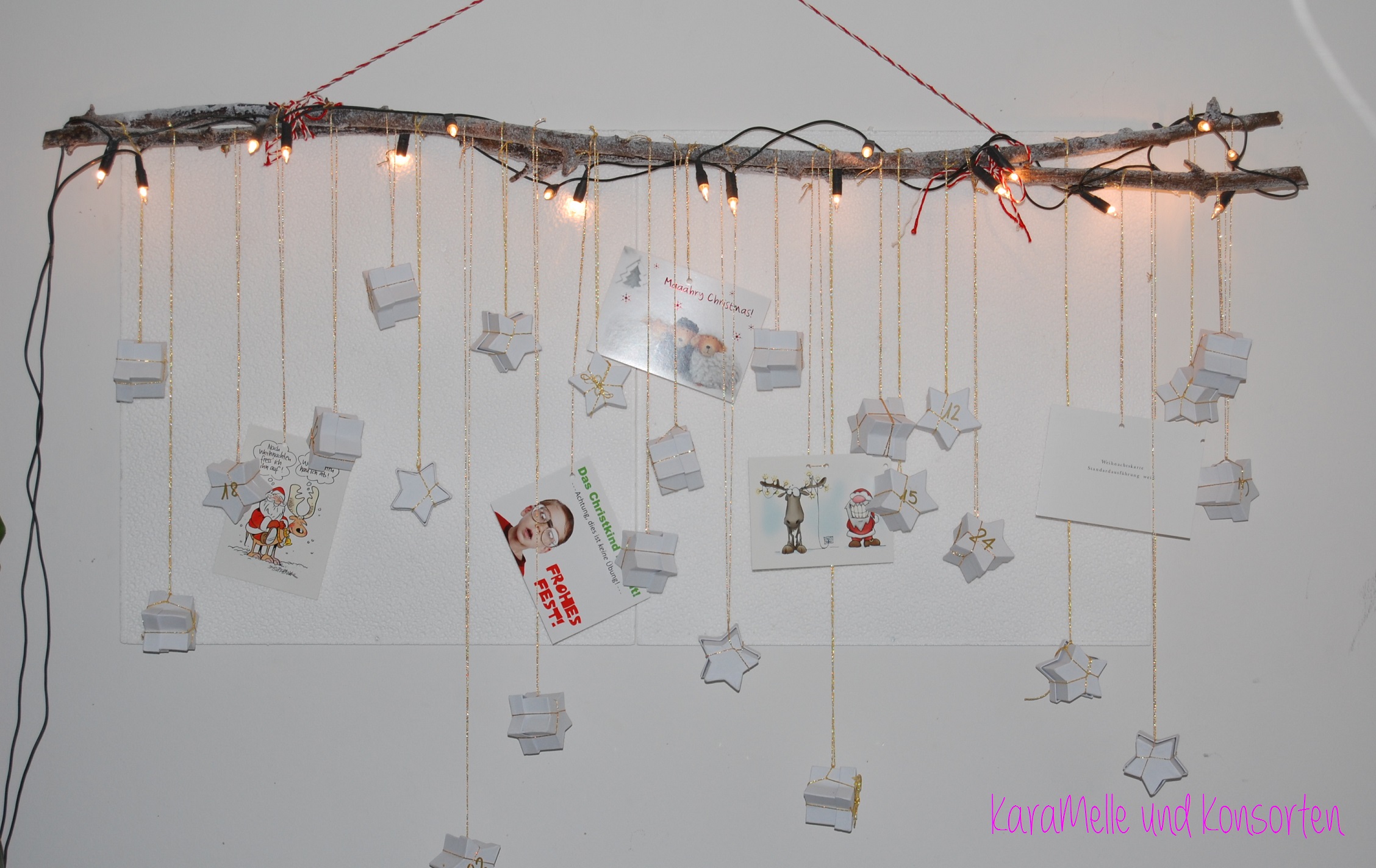 Im Bastelgeschäft 24 kleine Sternenkartons kaufen. Mit einem goldenen Lackstift die Zahlen von 1 – 24 auf die Sterne schreiben. Nach dem Trocknen mit Süßigkeiten aller Art füllen. Mit goldener Schnur oder goldenem Geschenkband an die Zweige hängen.