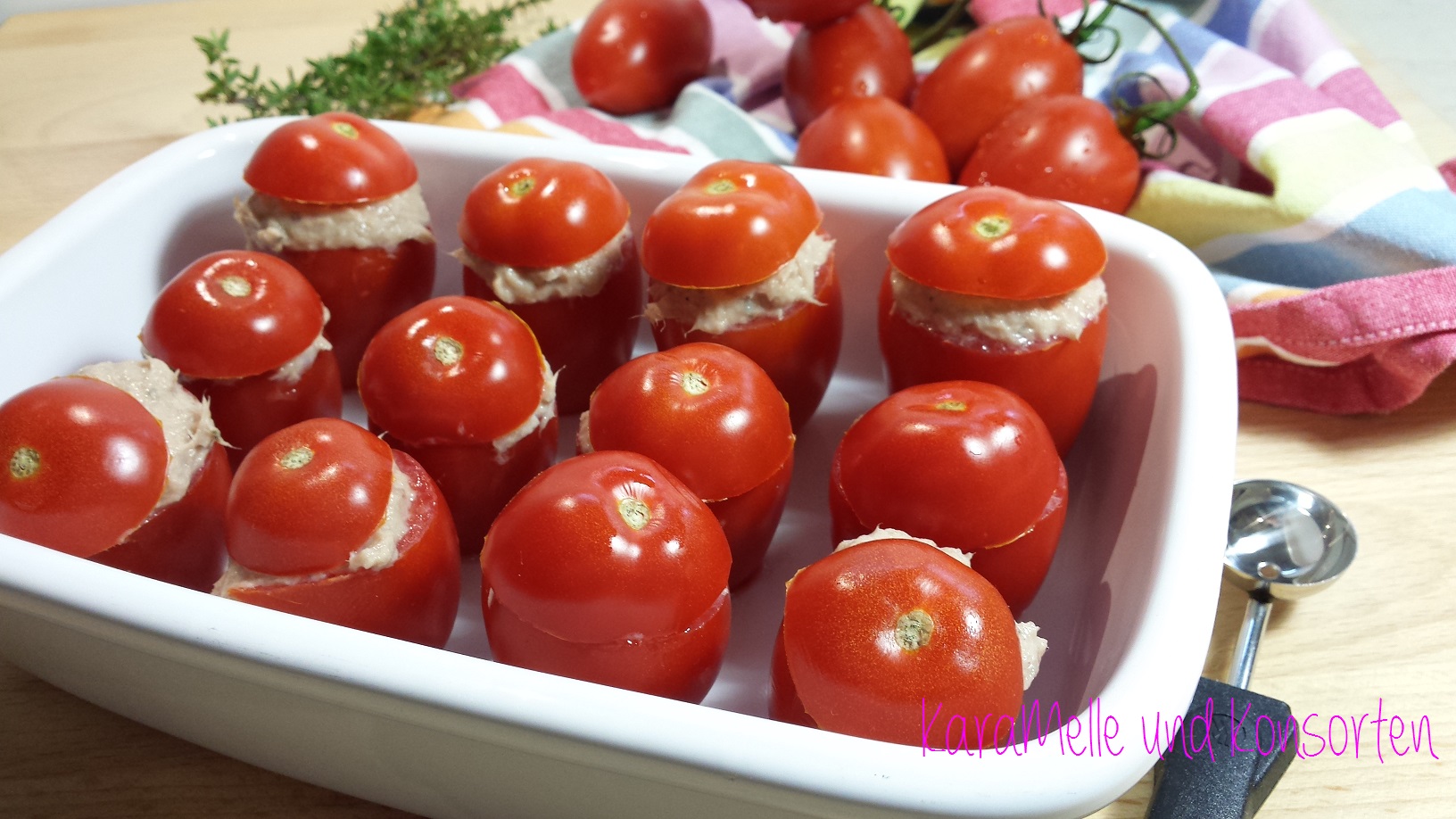 Das Thunfisch-Püree vorsichtig in die Tomaten füllen. Jeweils eine Deckelchen aufsetzen und in eine flache Servierform setzen. Dazu eventuell den Tomatenboden mit einem scharfen Messer begradigen, dass die Tomaten in der Form nicht umfallen.