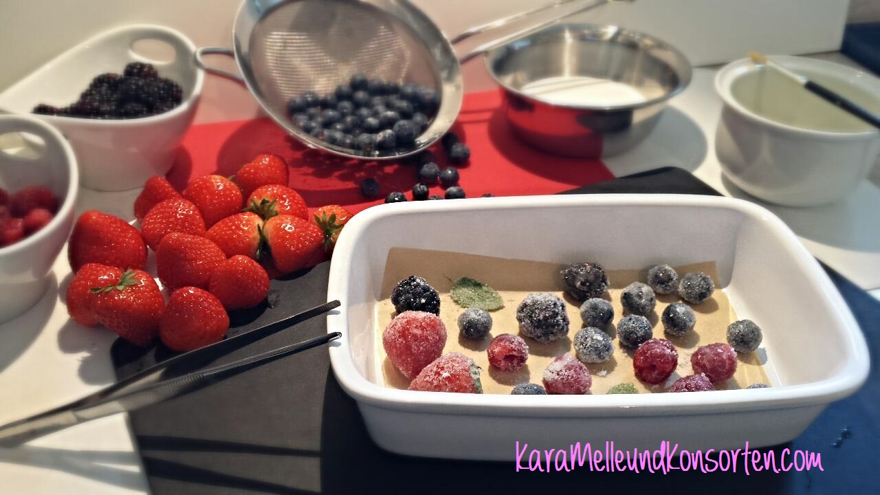 !! Die gezuckerten Beeren/Minzblättchen einige Stunden vor dem eigentlichen Backen zubereiten, da sie noch im Kühlschrank