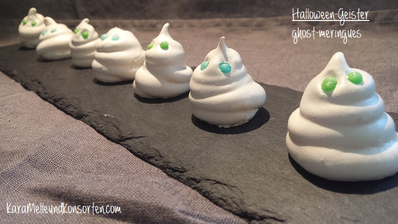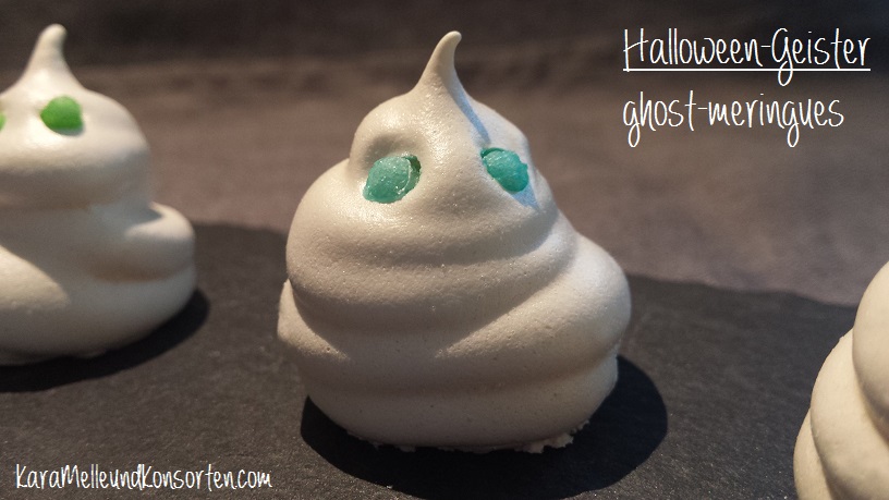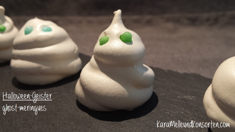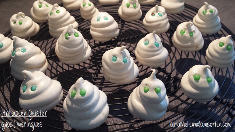 Die Zuckerperlen als Augen in die kleinen Gespenster drücken (geht am besten mit einer langen Backpinzette) und mitbacken oder Augen nach dem Backen auf die Gespenster malen!