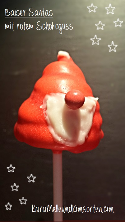 ⇒⇒ Wer die Baiser-Santas gerne auf Lolli-Stiele setzen möchte, sollte die Kegel mit einem Büchsenöffner nach dem Abkühlen vorsichtig vorbohren, die Lolli-Stielspitze in die geschmolzene Schokolade tauchen und vorsichtig die Baiser aufsetzen. Die Baiser nicht übergießen, sondern vorsichtig im Schokoguß drehen, so dass auch die Unterseite mit gefärbt wird. Ist die Schokolade getrocknet, halten die Santas so viel besser auf den Stielen!!!